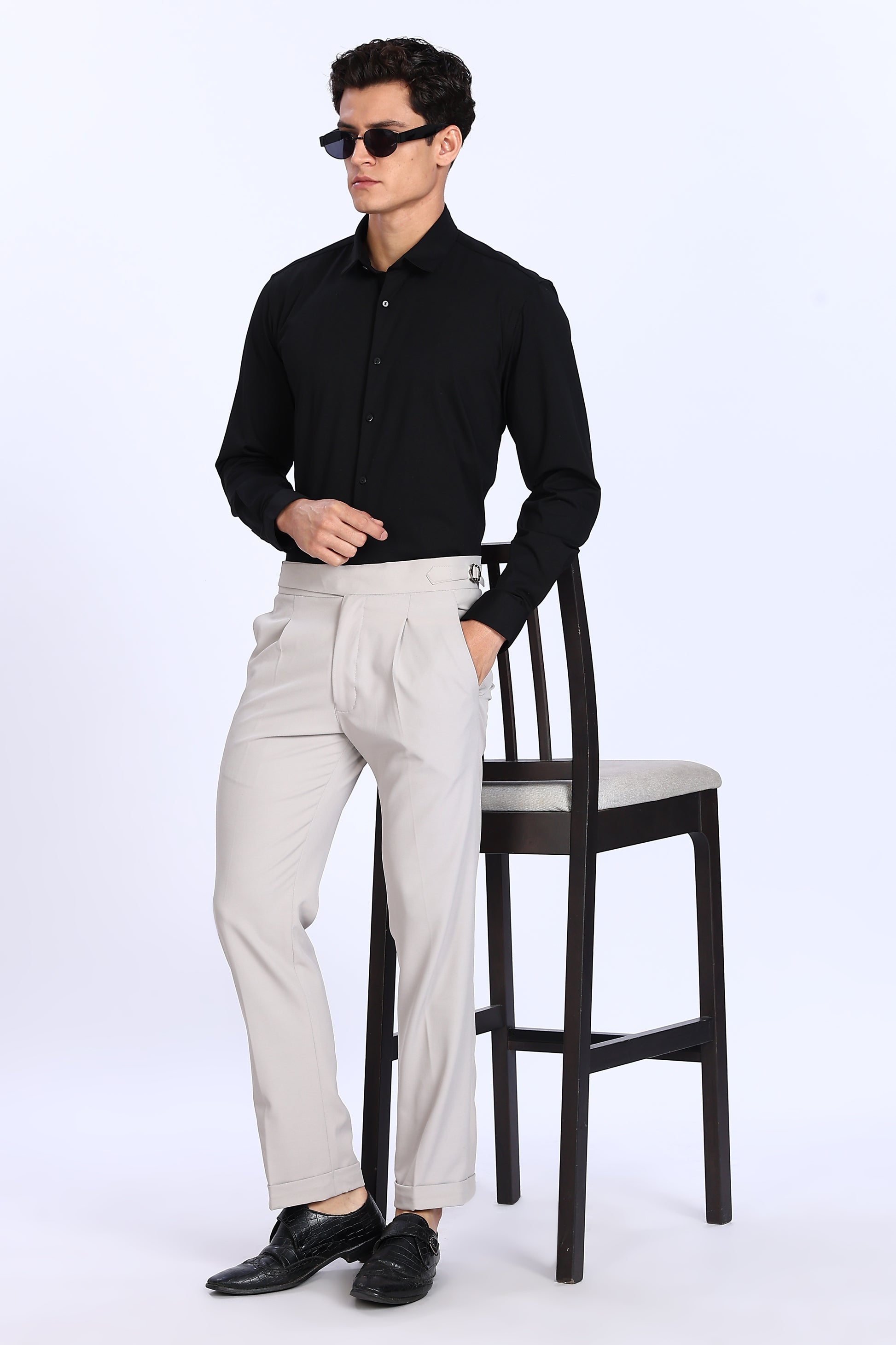 Slim-fit black full-sleeve shirt with button-down front, crafted from smooth fabric for a sleek, modern look. Ideal for formal or casual wear, offering comfort and style in any setting.