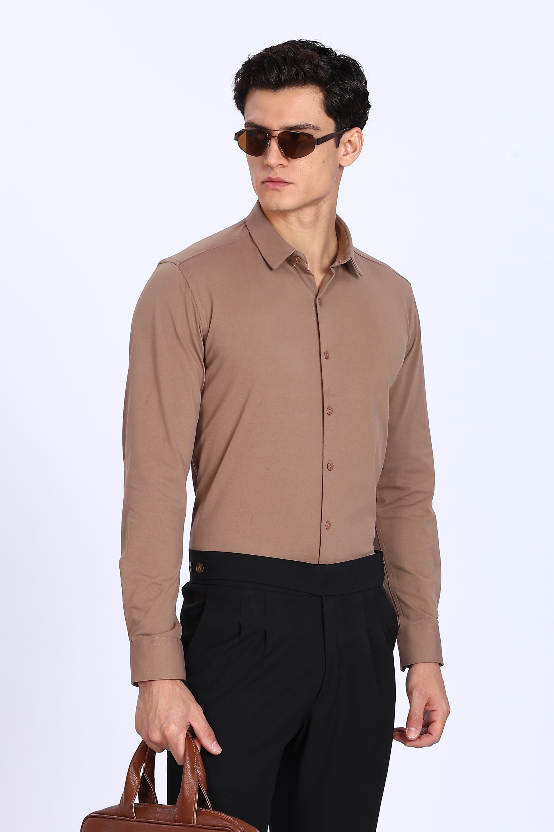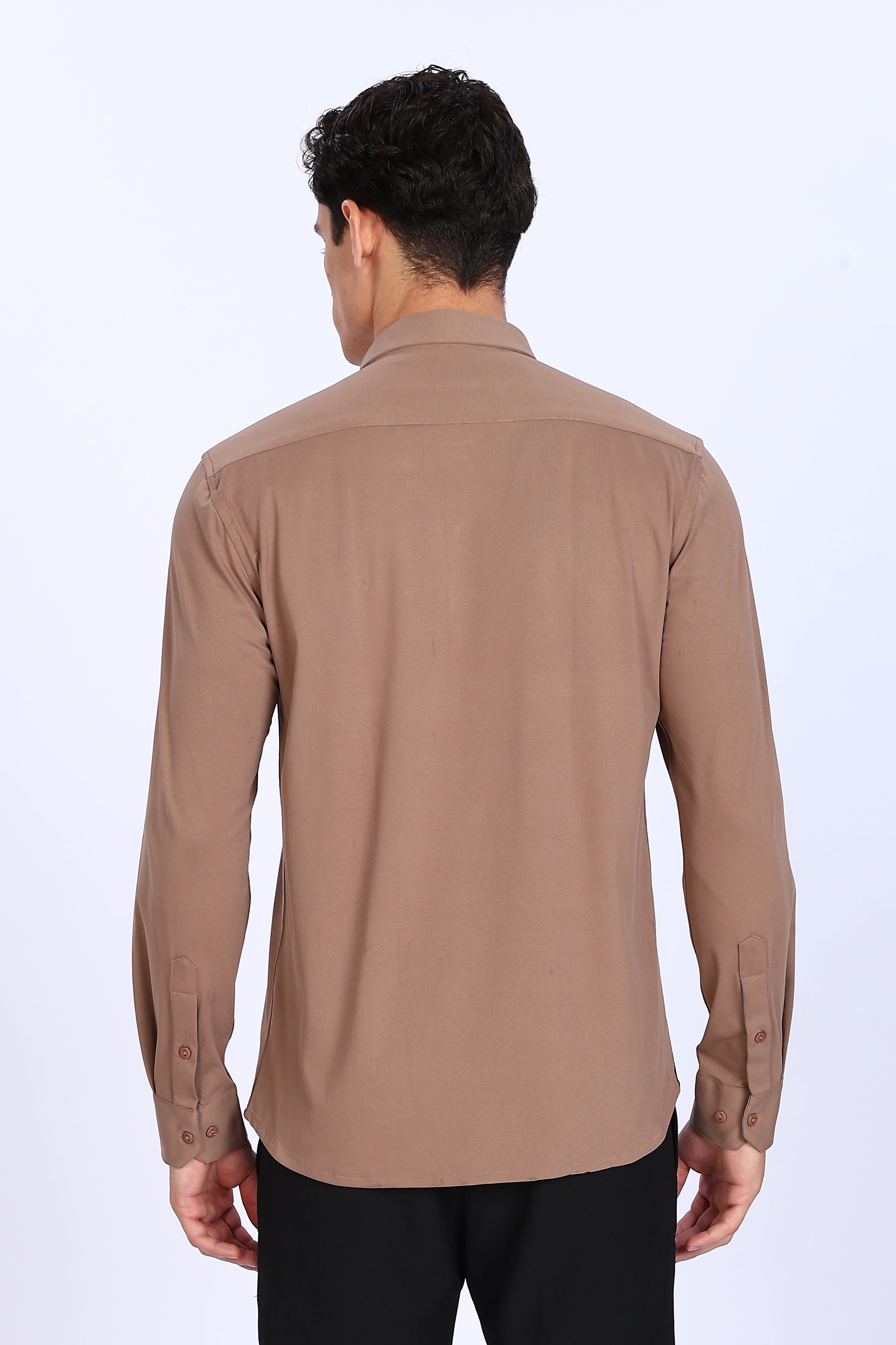 Slim-fit men's shirt in a solid light brown shade, featuring long sleeves, a classic collar, and button-down front. Made from soft, breathable fabric for all-day comfort, ideal for formal or casual wear.