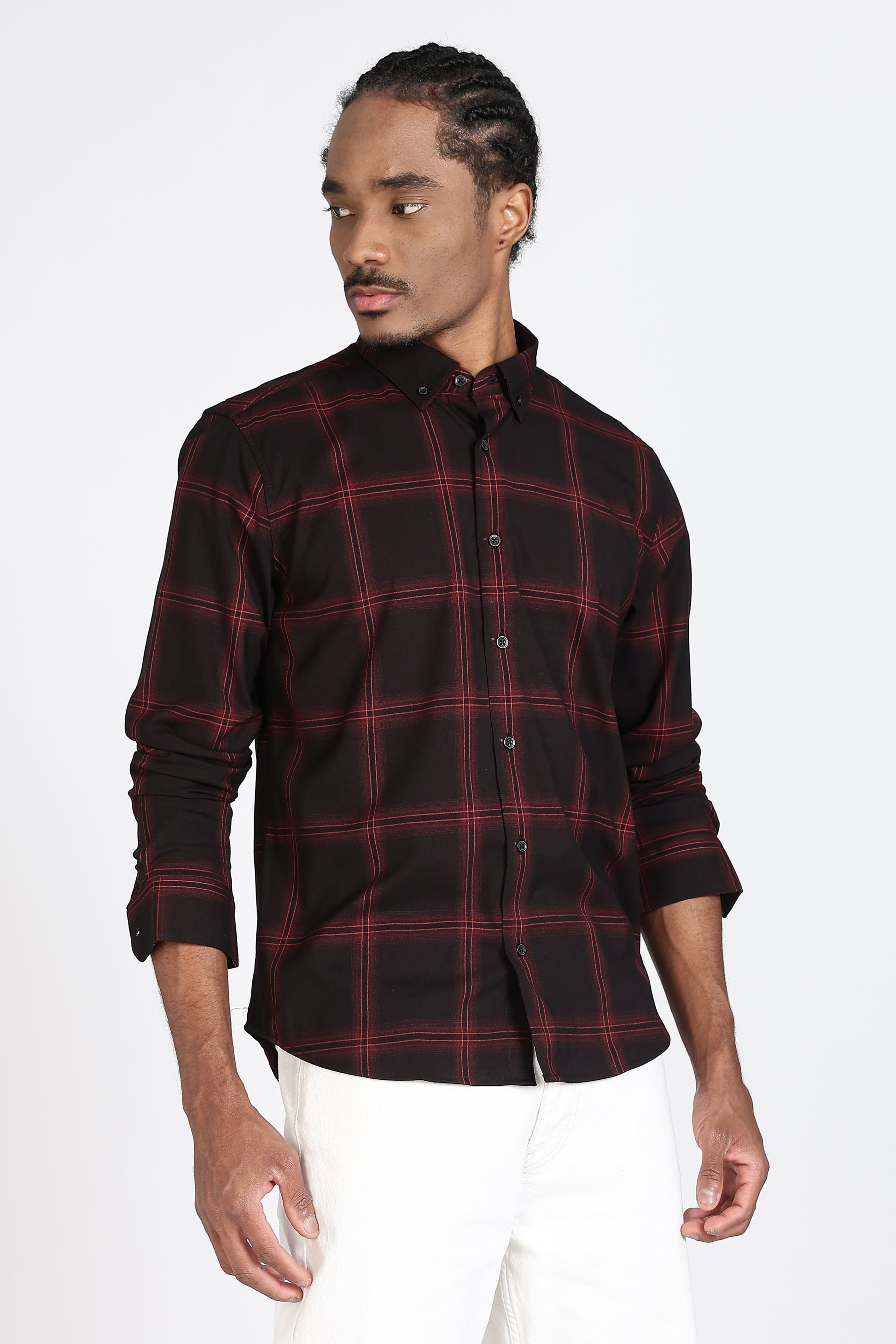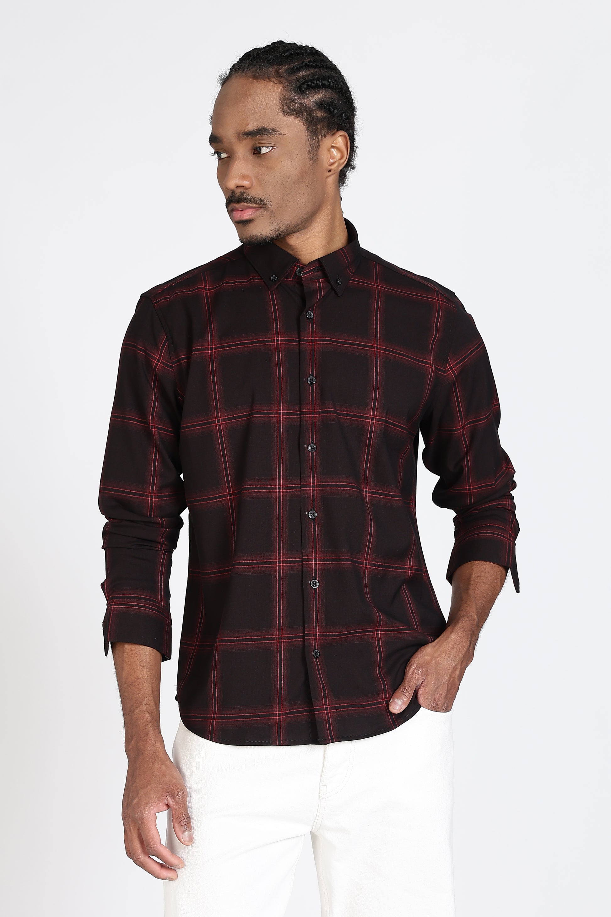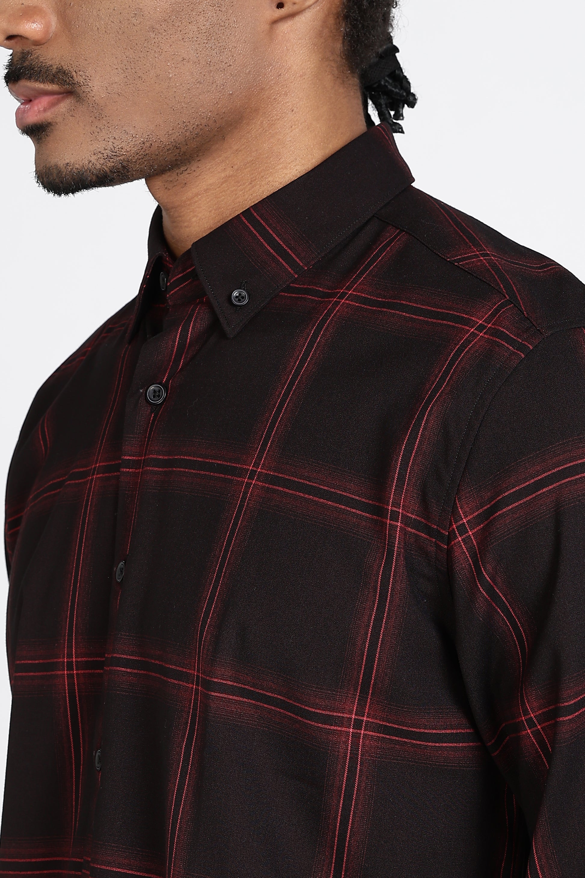 A men's dark button-up shirt featuring a thin red and black plaid pattern. The sleeves are cuffed at the elbows and the collar is unbuttoned.