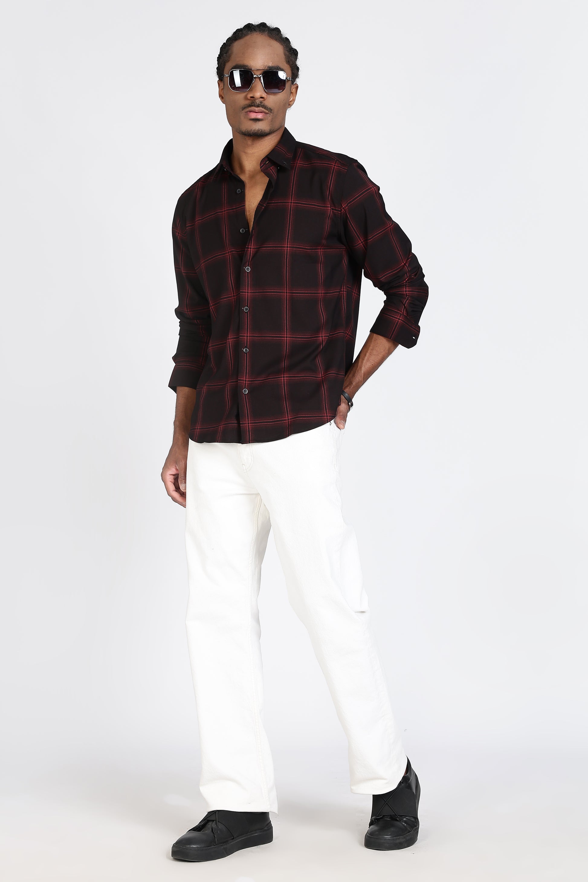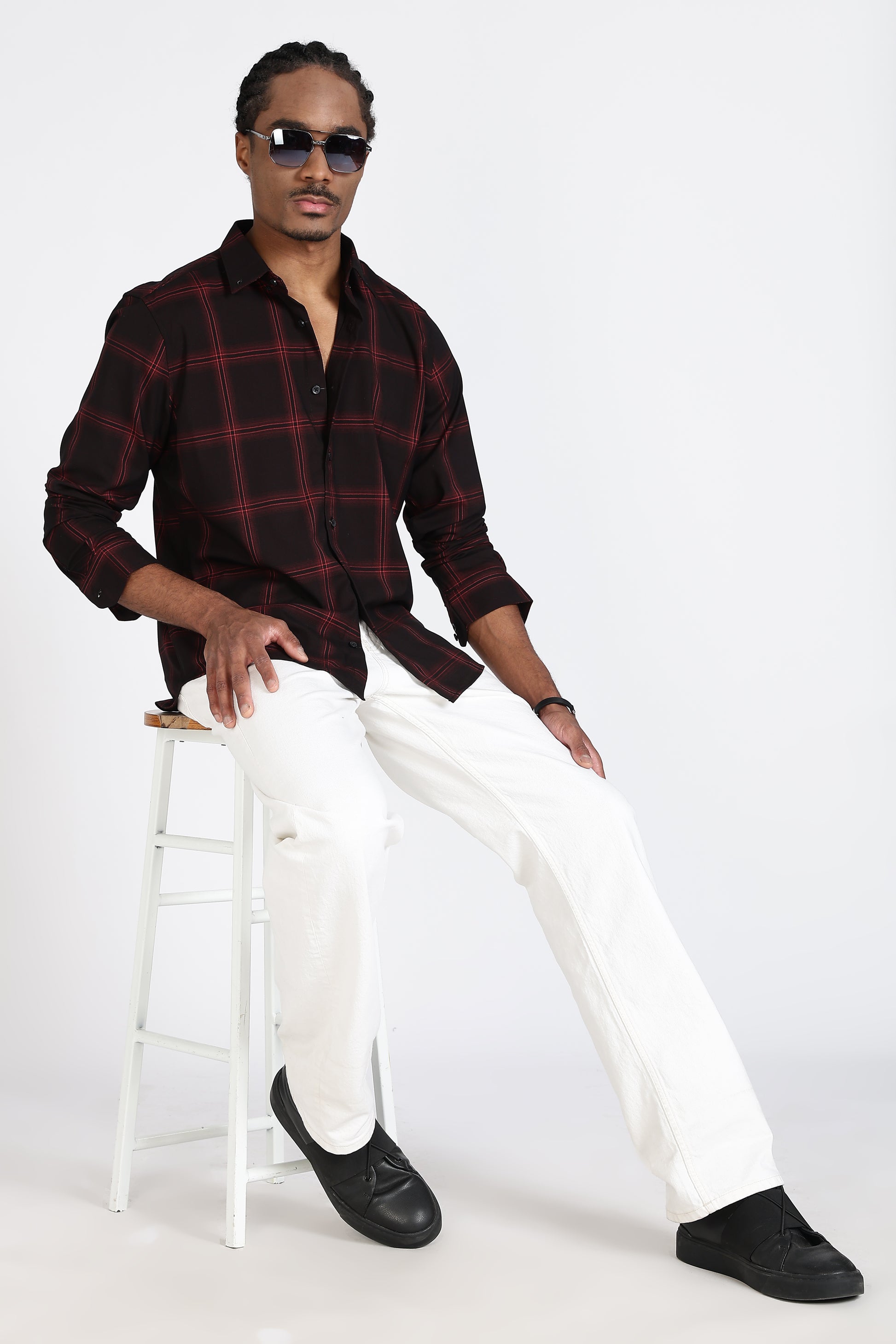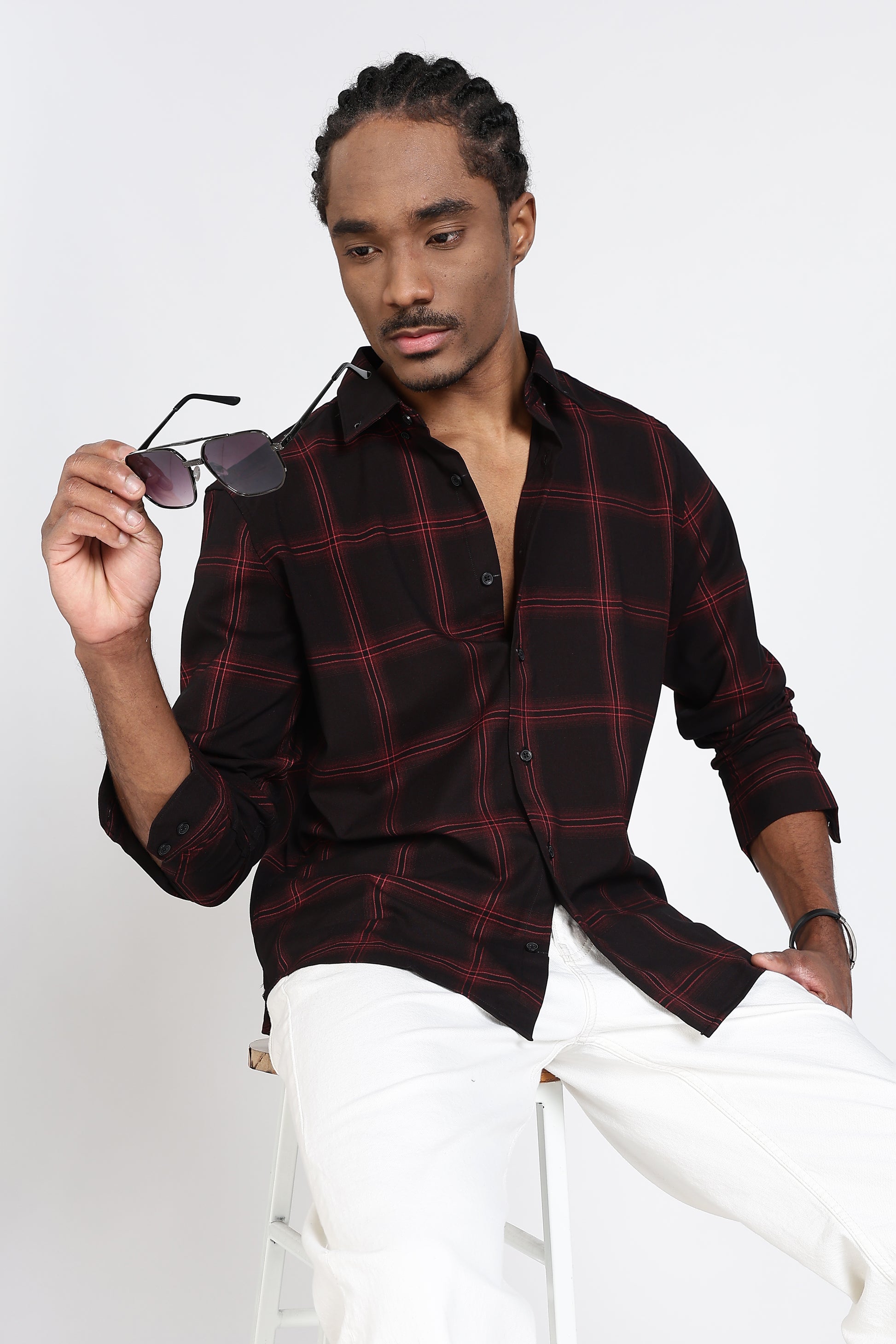 A men's dark button-up shirt featuring a thin red and black plaid pattern. The sleeves are cuffed at the elbows and the collar is unbuttoned.