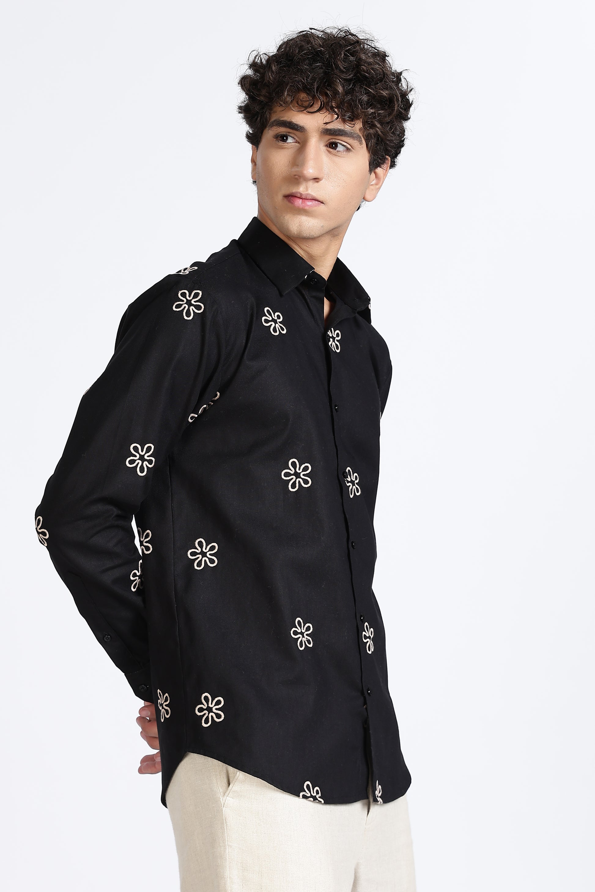 This shirt is styled in a solid black base with embroidered floral motifs, creating a refined yet contemporary look. Made from a soft cotton blend, it features a regular fit, classic collar, and full sleeves for comfort and versatility. Ideal for evening outings or special occasions, it pairs effortlessly with trousers or denim for a polished statement.