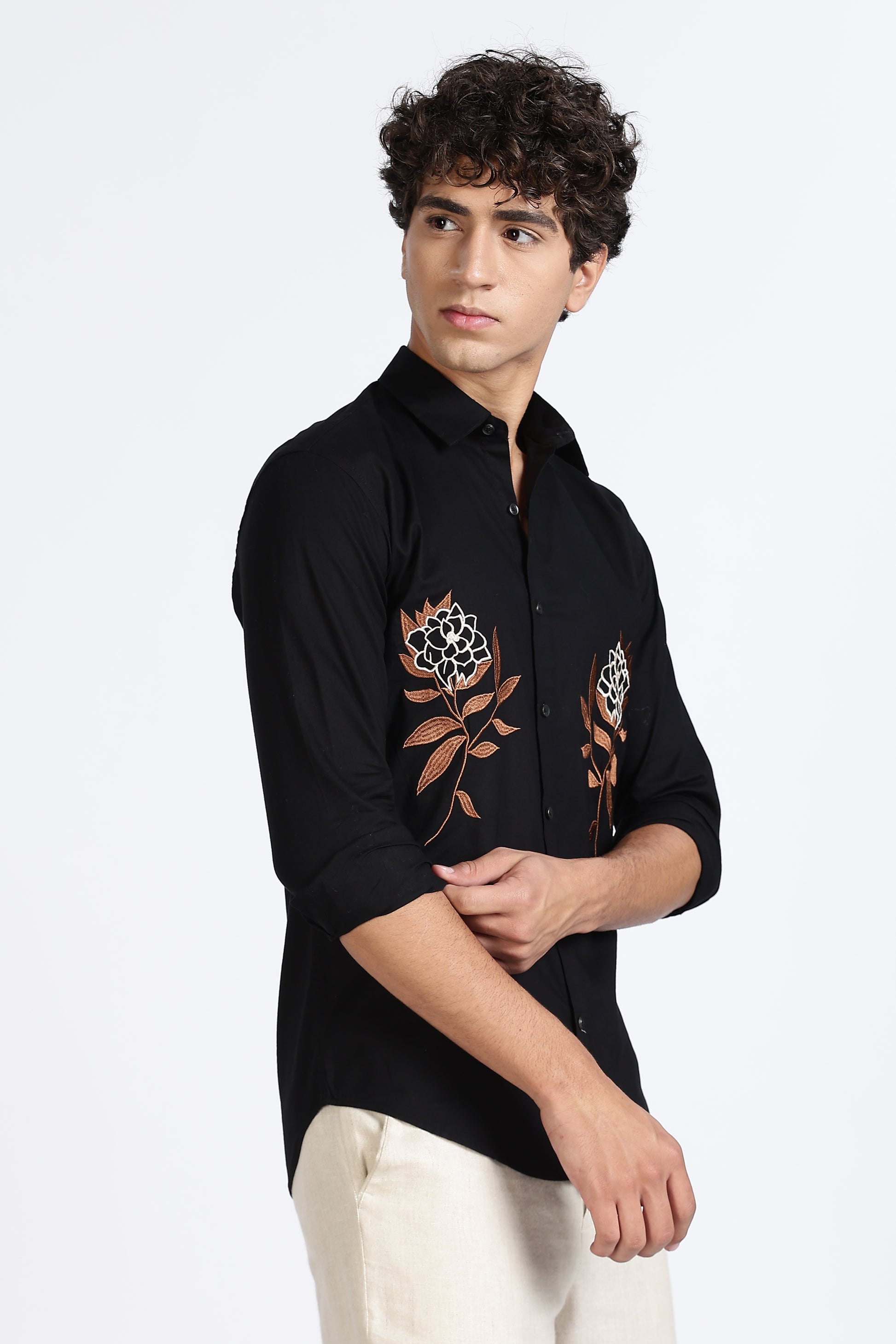 This shirt is styled in a sleek black base with intricate floral embroidery on the front, creating a bold and elegant statement. Made with a comfortable cotton blend, it features a regular fit, classic collar, and full sleeves, offering a balance of style and versatility. Perfect for evening wear, festive occasions, or standout casual looks, it pairs well with both trousers and denim.