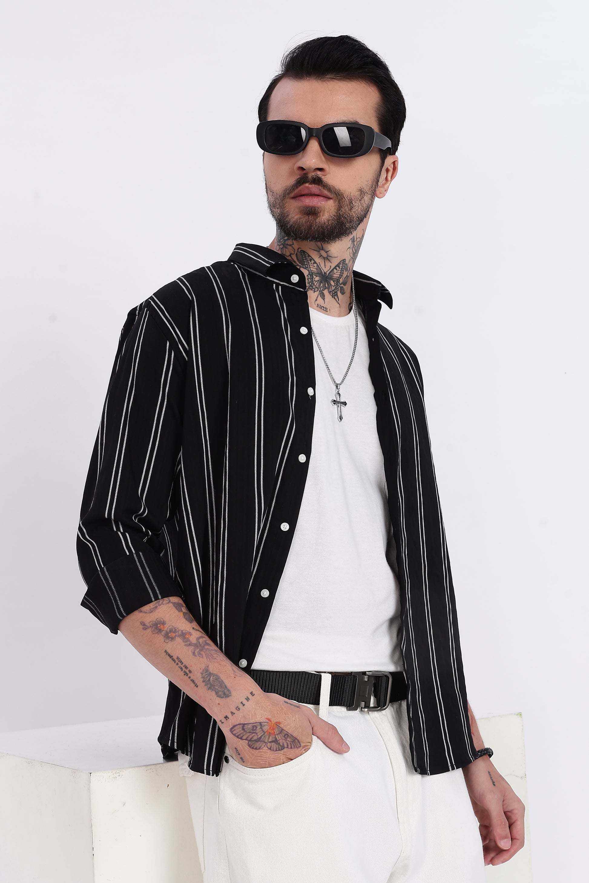 Designed for men who appreciate standout style, this Black Vertical Stripe Shirt brings a bold yet refined look to every occasion. Tailored in a regular fit using soft technical stretch fabric, it offers all-day comfort with wrinkle-resistant performance and a crisp fall. Classic collar, full sleeves, and contrast white buttons enhance its premium appeal - ideal for casual outings, Friday formals, dinners, and smart streetwear styling.