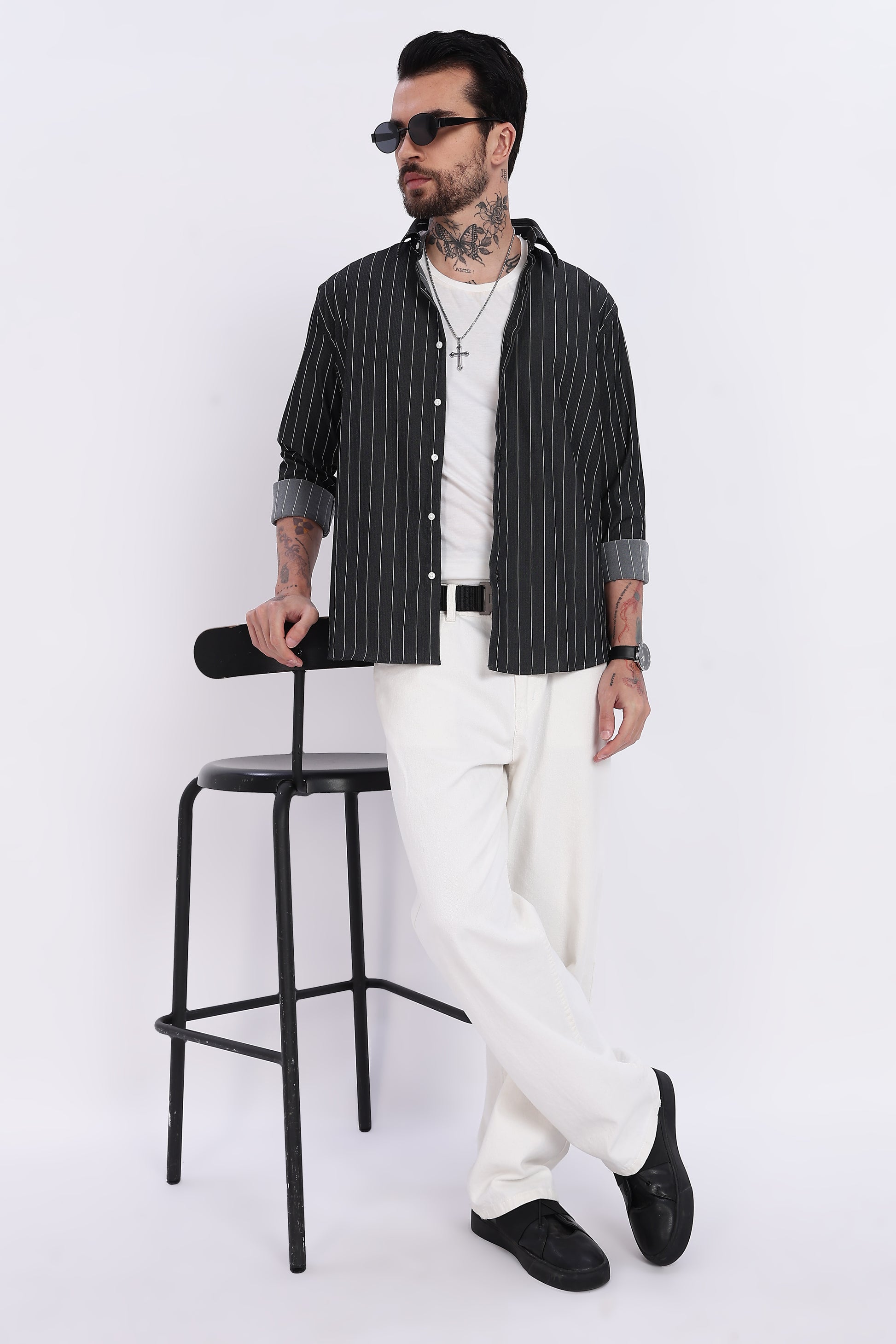 Crafted in premium technical stretch fabric, this charcoal black striped shirt blends modern confidence with effortless comfort. The sharp white vertical stripes add height and a sleek silhouette, making it a perfect choice for work, dinners, and smart-casual outings. Designed in a regular fit for easy movement throughout the day.