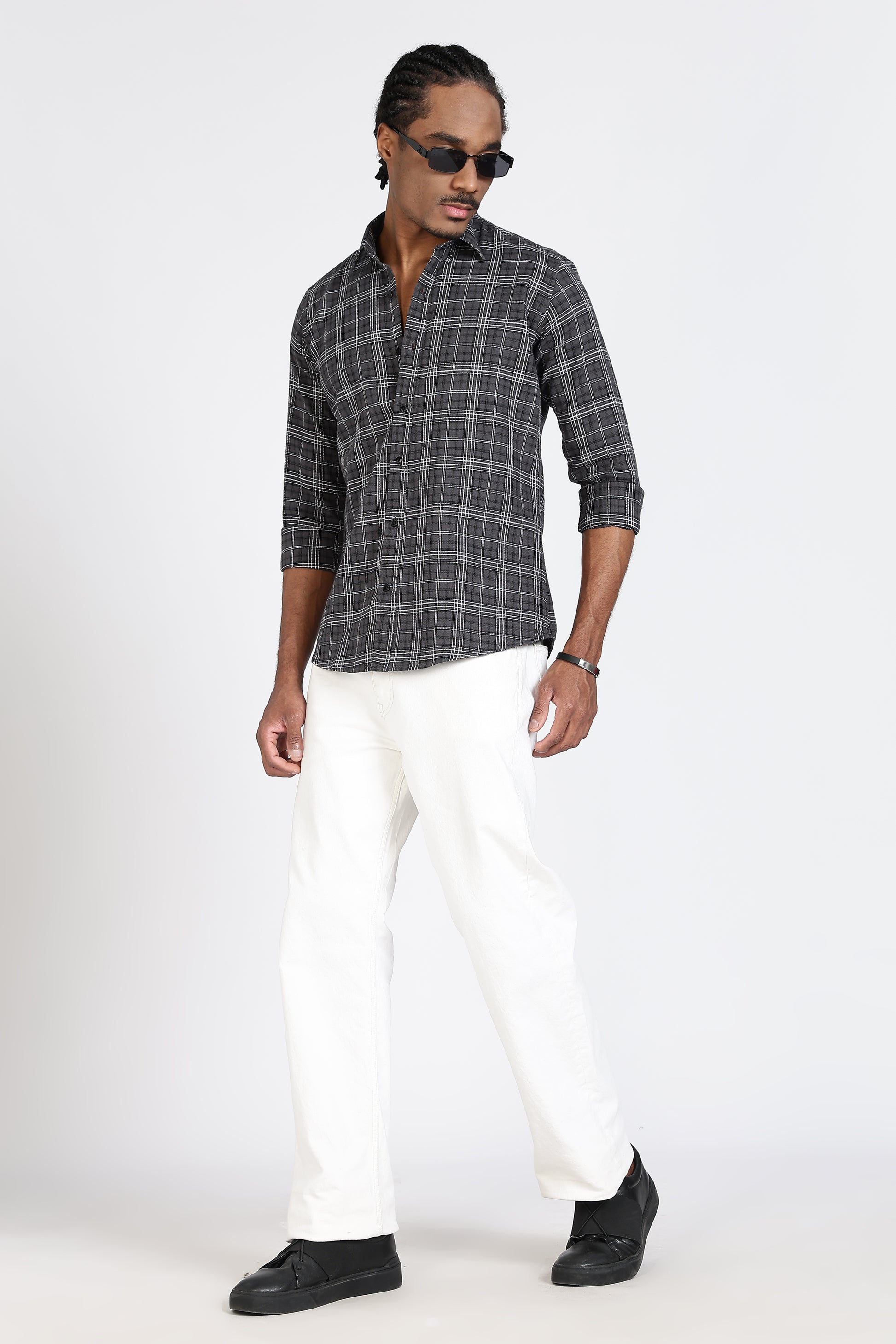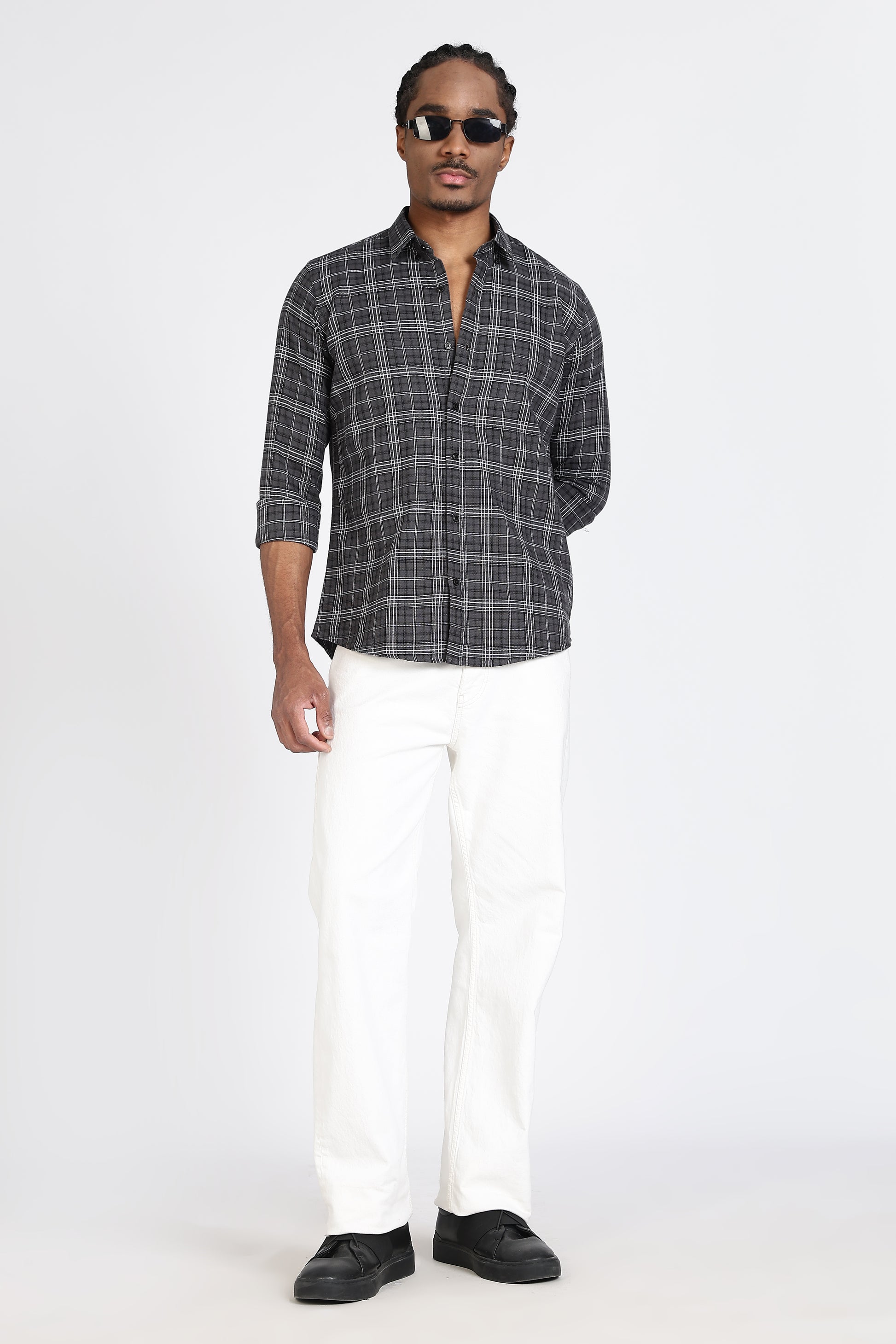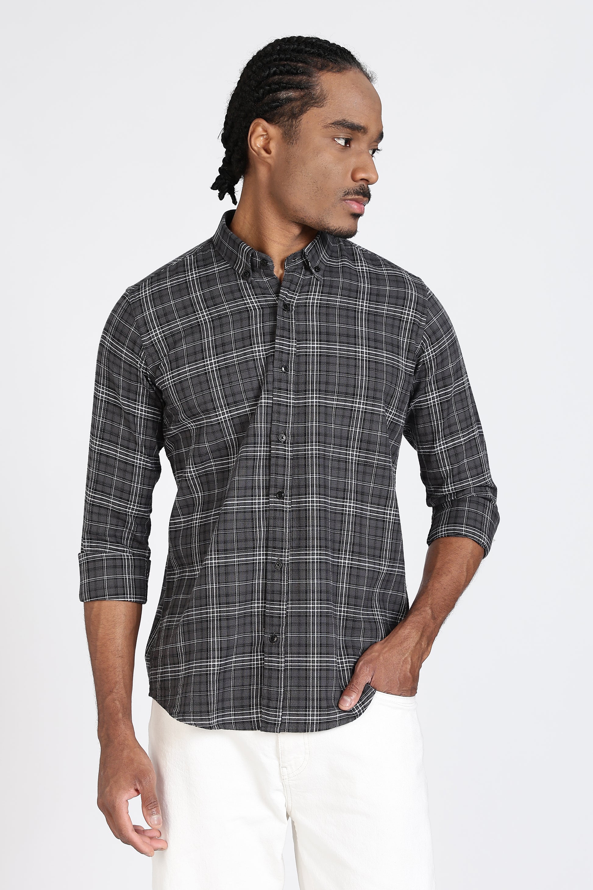 Black and grey checkered cotton shirt with button-down front, point collar, and long sleeves. Soft, breathable fabric for all-day comfort. Ideal for casual or semi-formal wear.