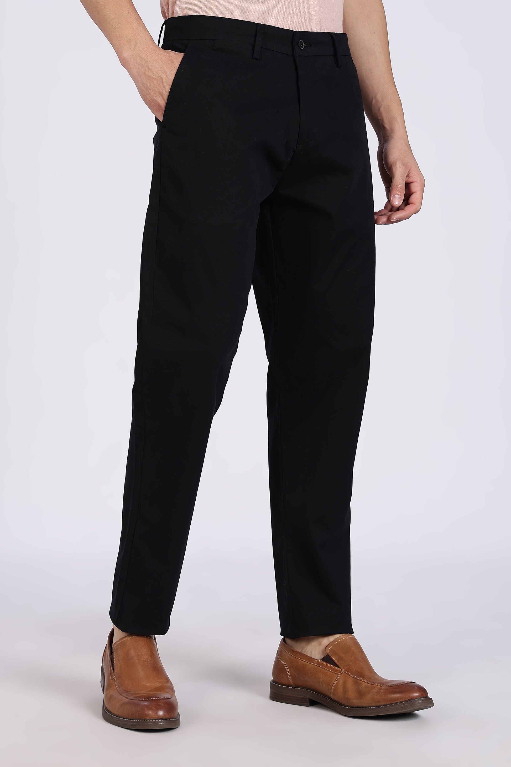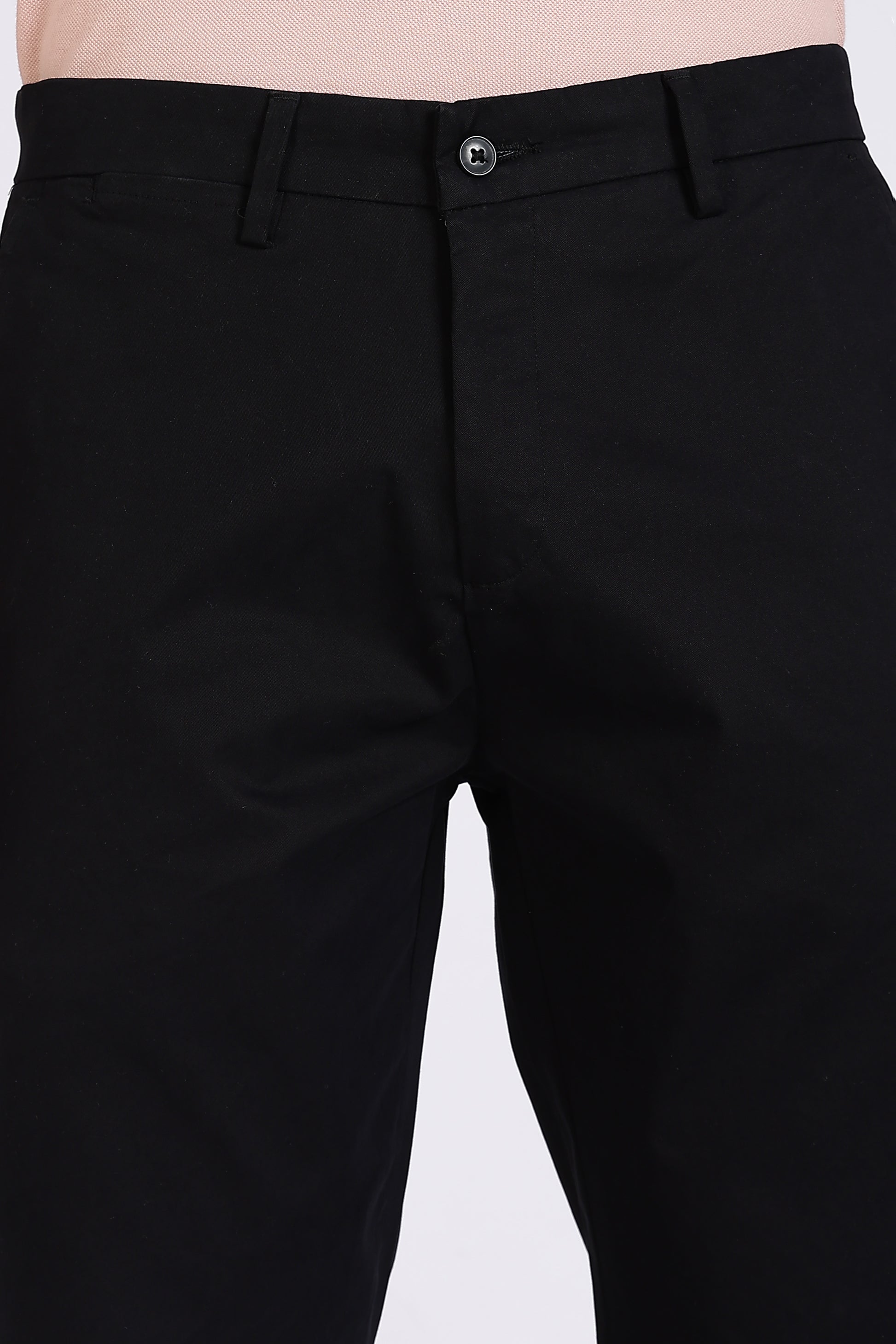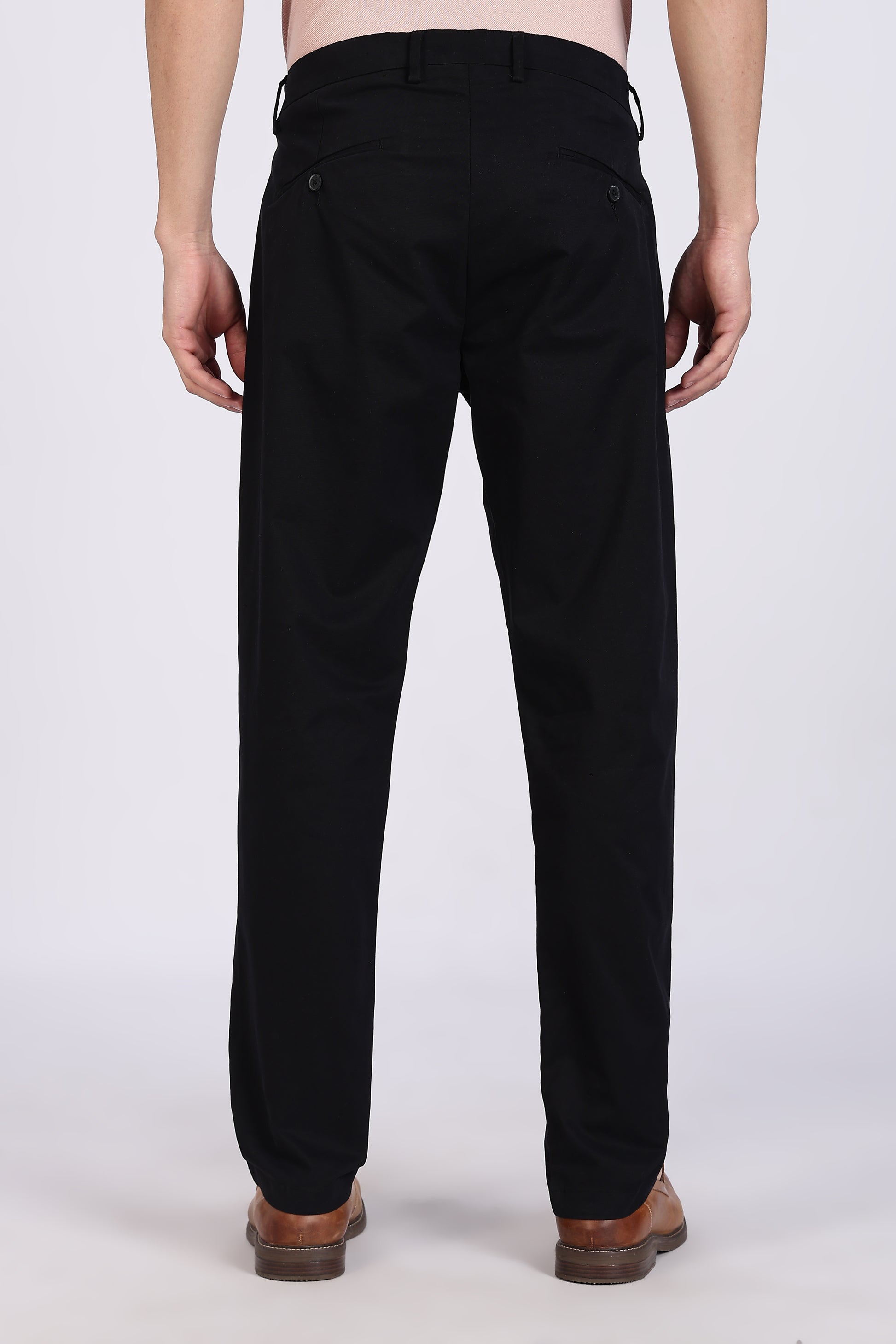 Crafted in a sleek black shade, these chinos are a must-have staple for every wardrobe. Designed with a regular fit and ankle-length cut, they offer a sharp silhouette while ensuring day-long comfort. The plain cotton fabric makes them versatile enough to pair with formal shirts, polos, or even casual tees, making them ideal for office, parties, and evening outings.