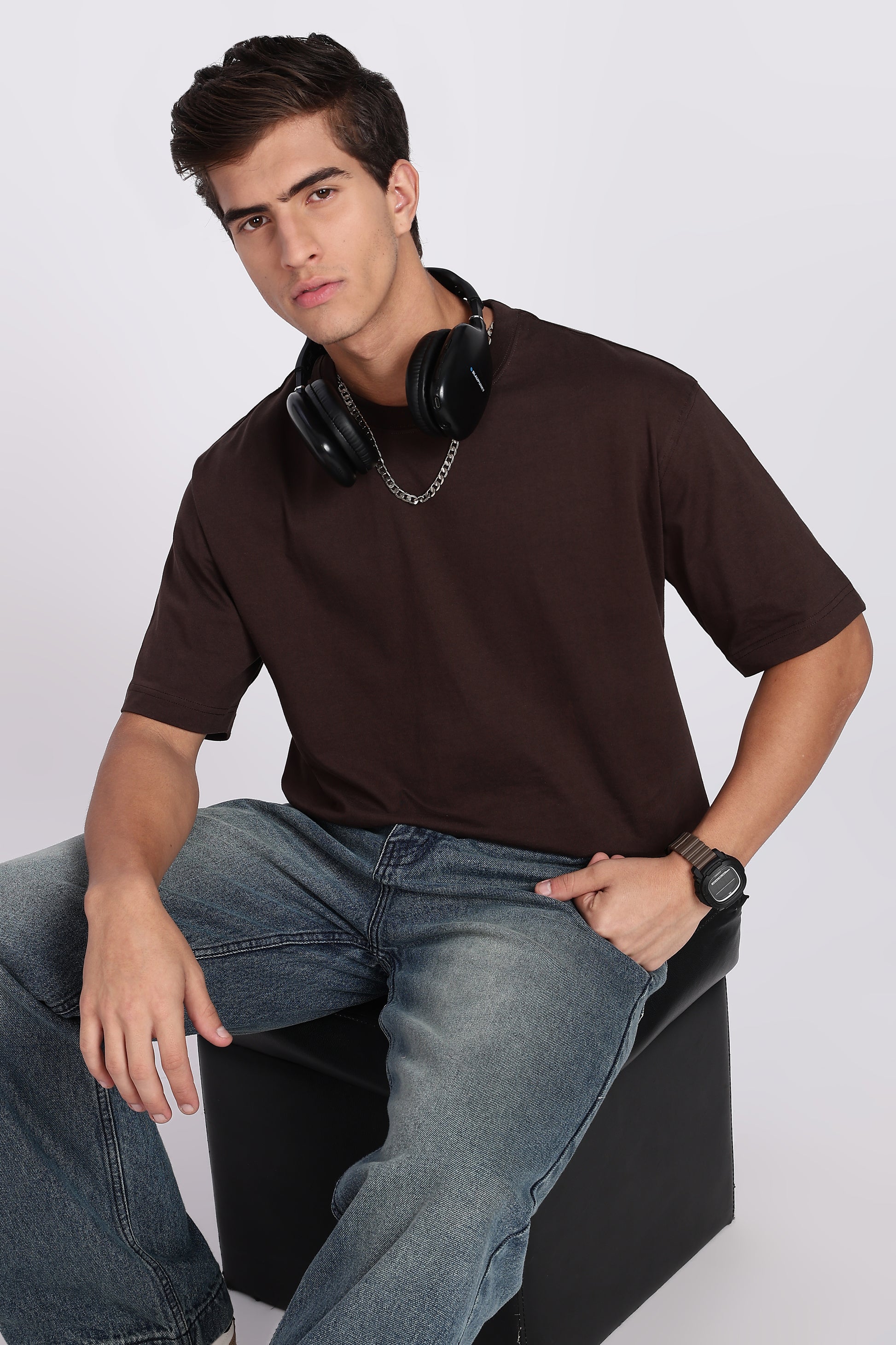 Five-Sleeve Drop Shoulder Cofee Brown T-Shirt
