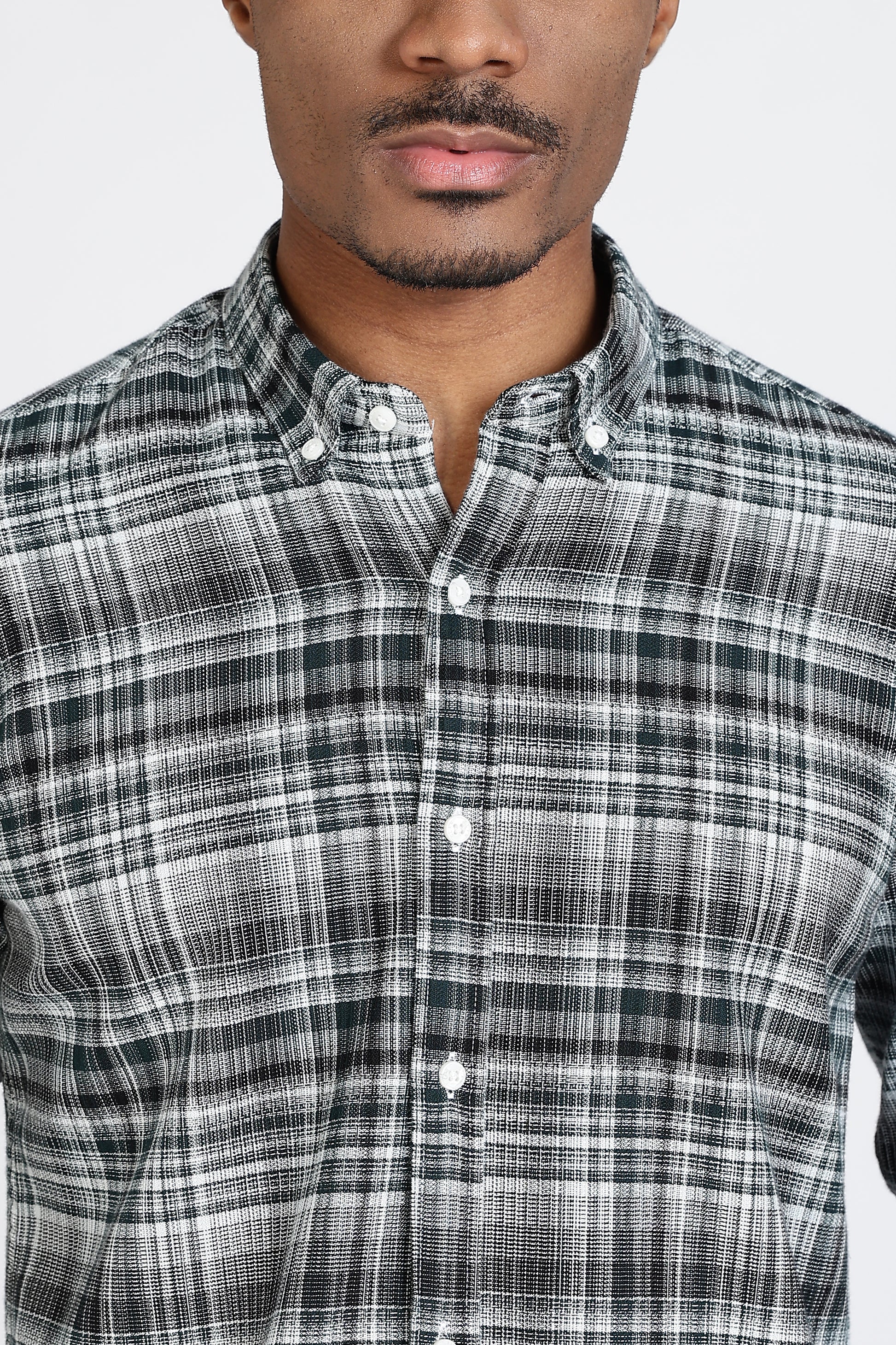 A men's long-sleeved shirt with a black, gray, and white plaid pattern. The sleeves are cuffed, and the shirt is unbuttoned at the neck.