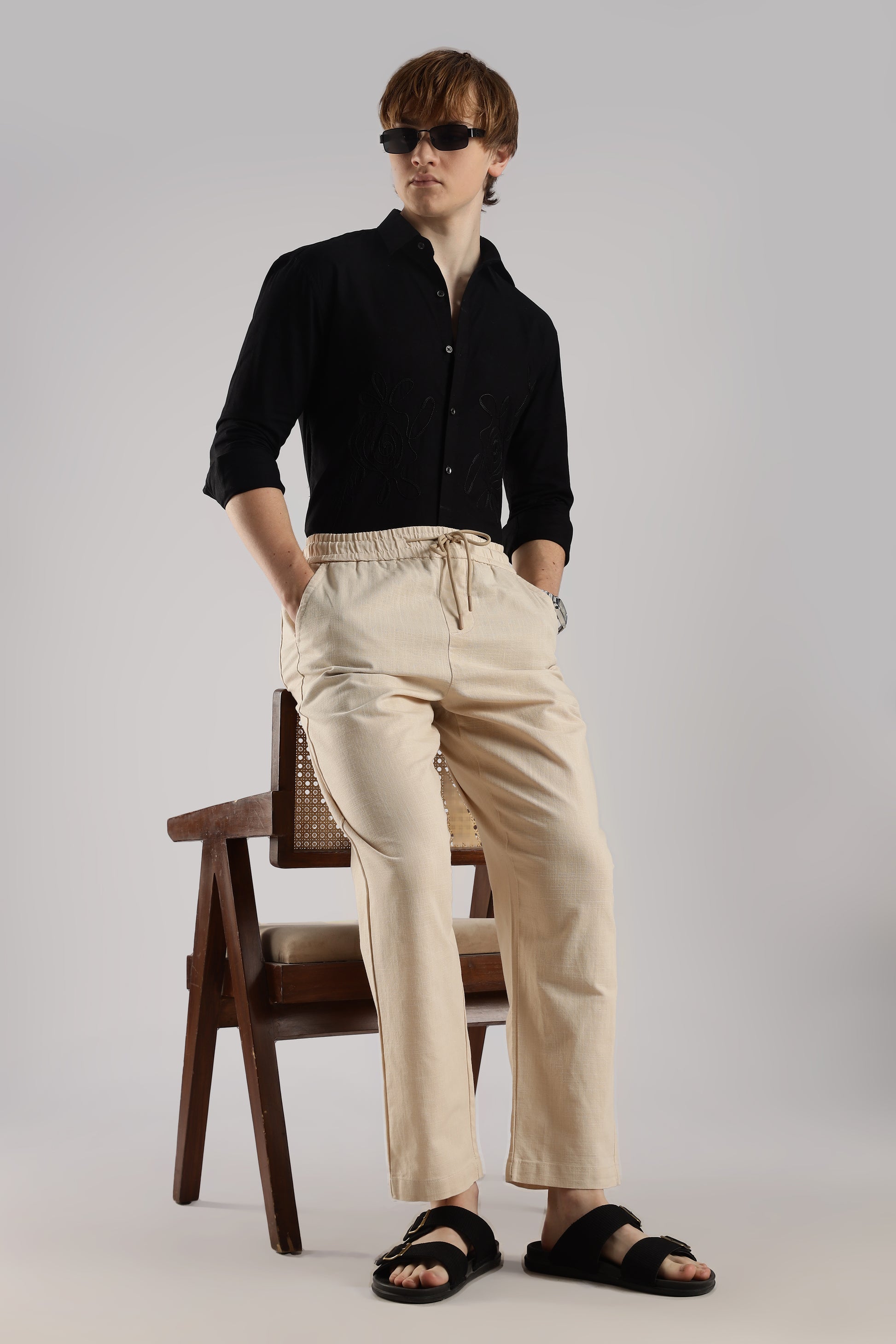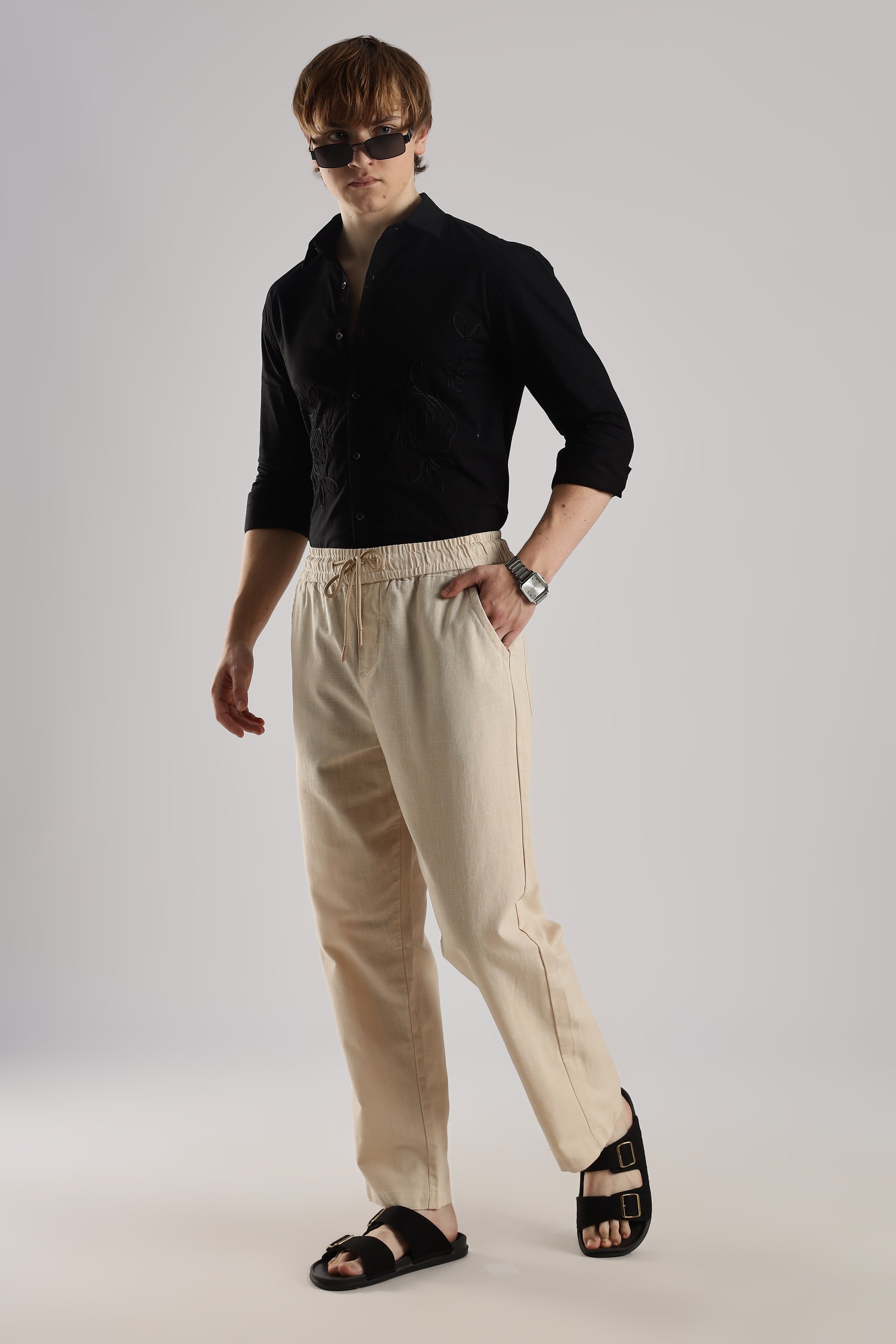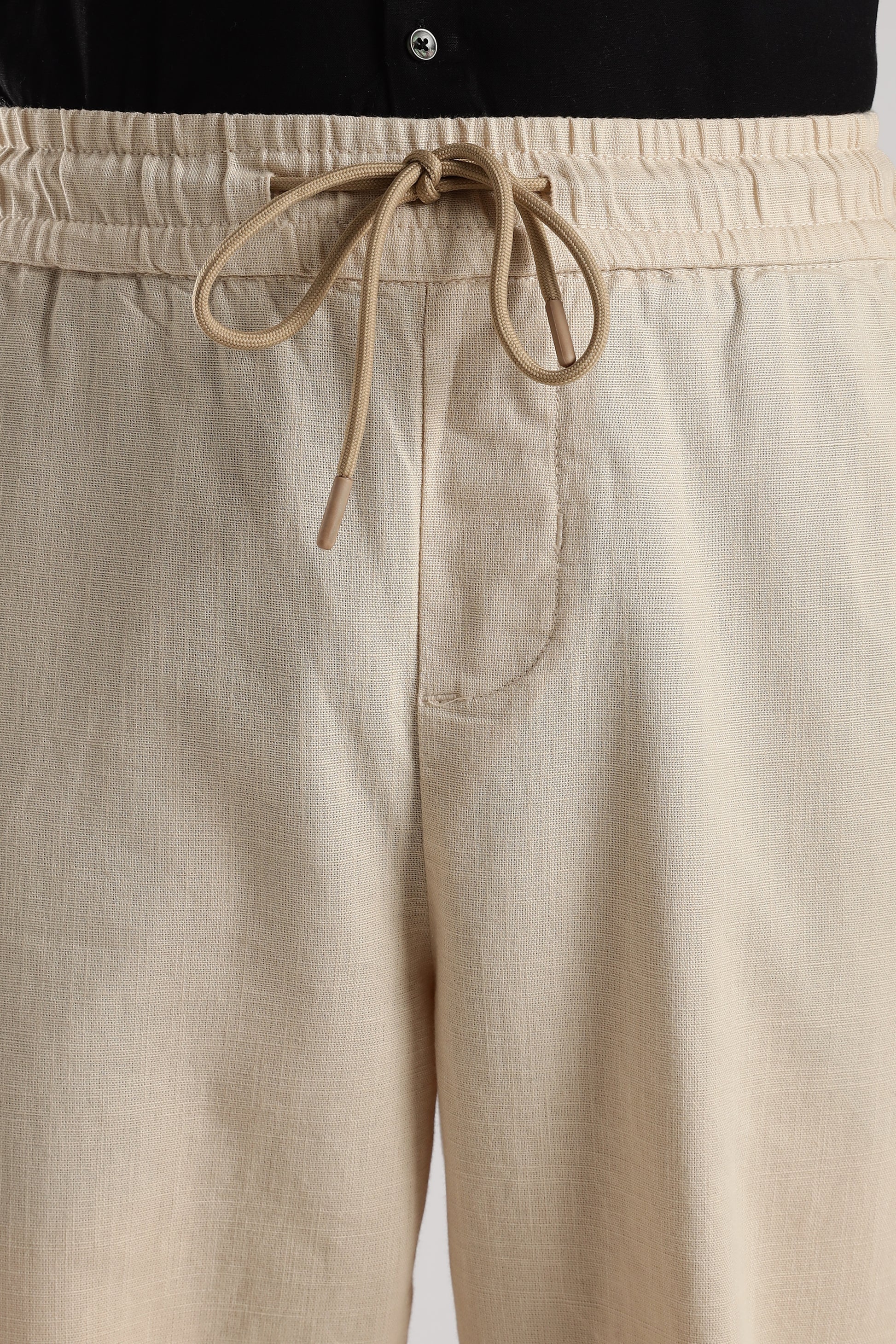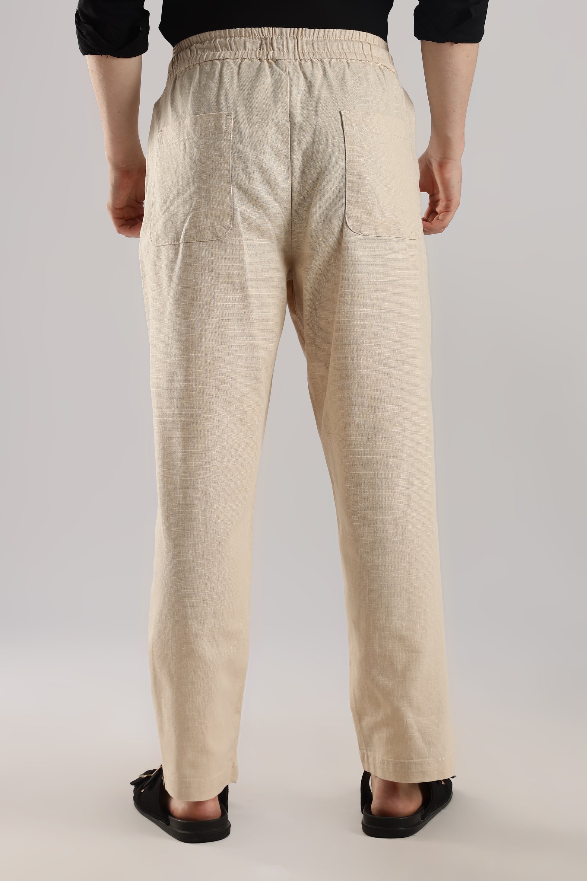 These pants are crafted in a light beige shade with a plain linen texture, giving them a soft and versatile look. Featuring a regular fit, ankle-length cut, and an elastic waistband with drawstring, they combine comfort with effortless style. The breathable linen fabric makes them perfect for summer wear, casual outings, or relaxed evening looks.