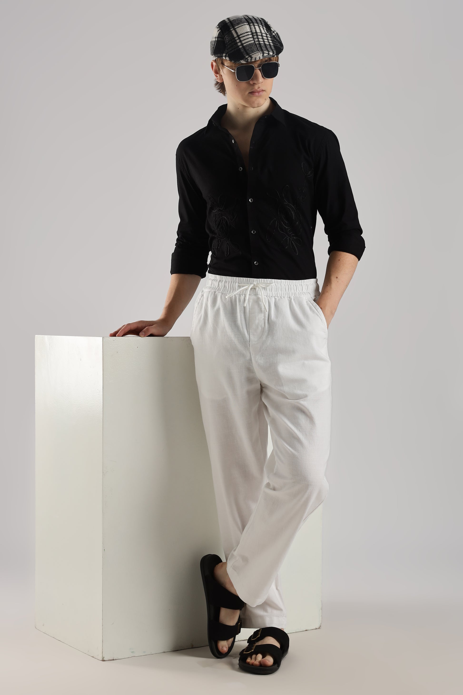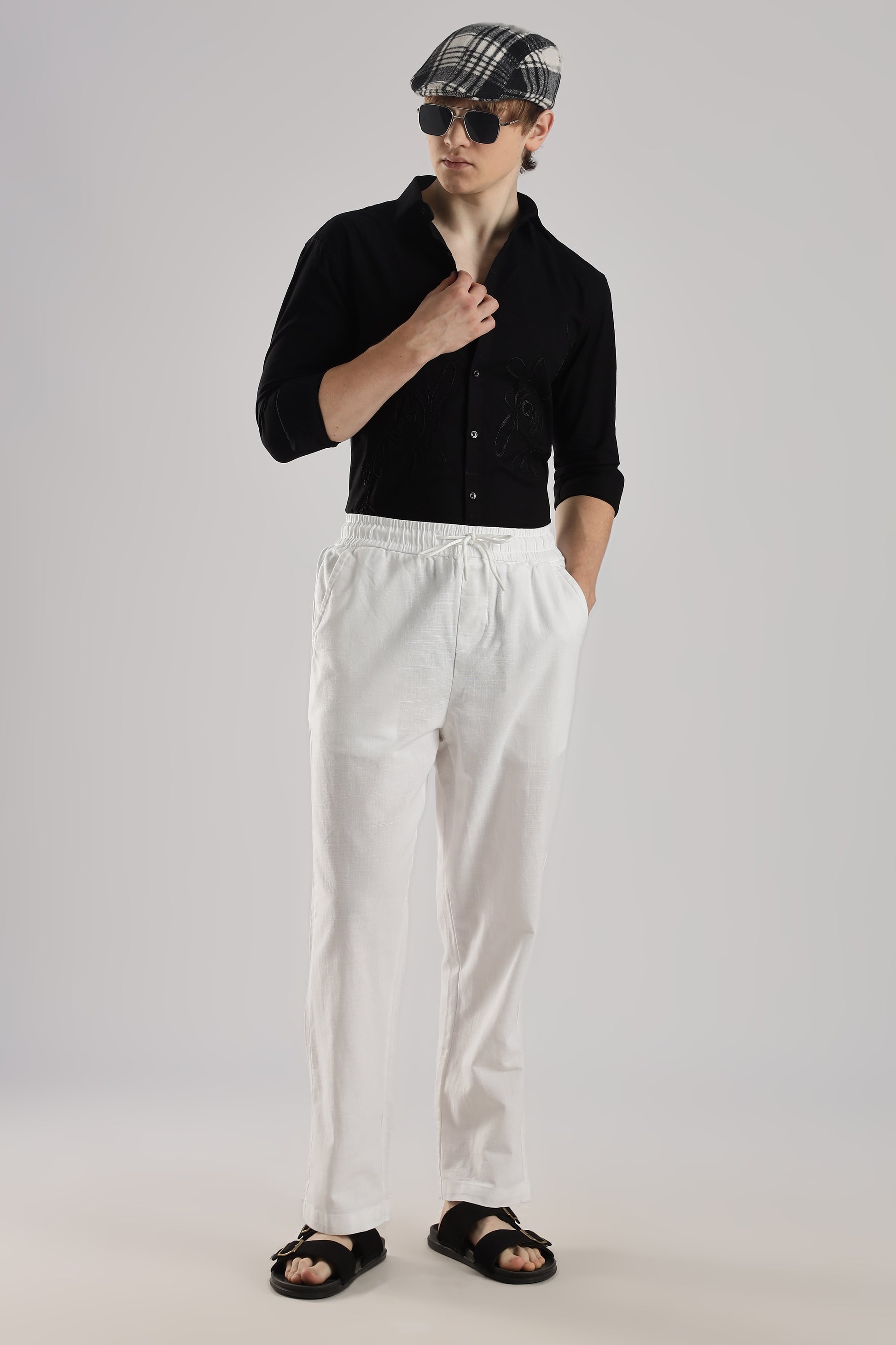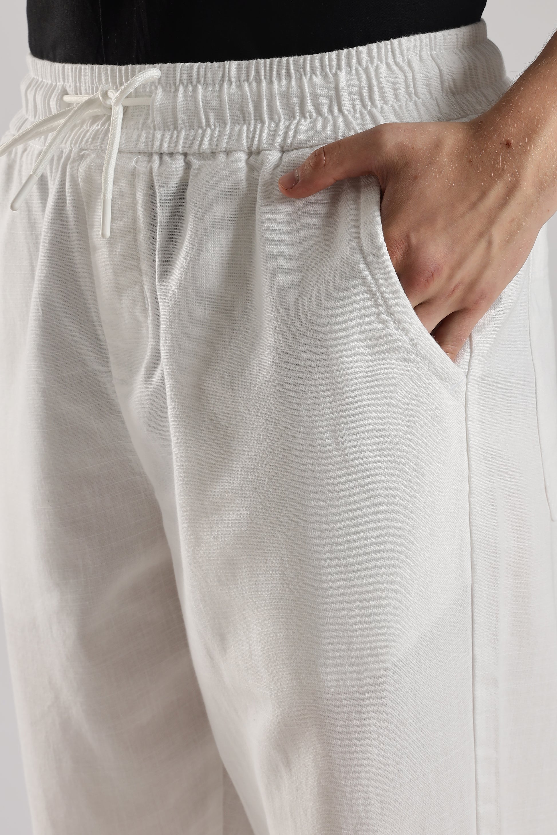 These pants are styled in a crisp white shade with a plain linen finish, offering a clean and timeless look. Designed with a regular fit and ankle-length cut, they provide a relaxed silhouette that ensures comfort throughout the day. The lightweight, breathable linen fabric makes them perfect for summer wear, effortlessly pairing with both light and dark shirts for versatile styling.