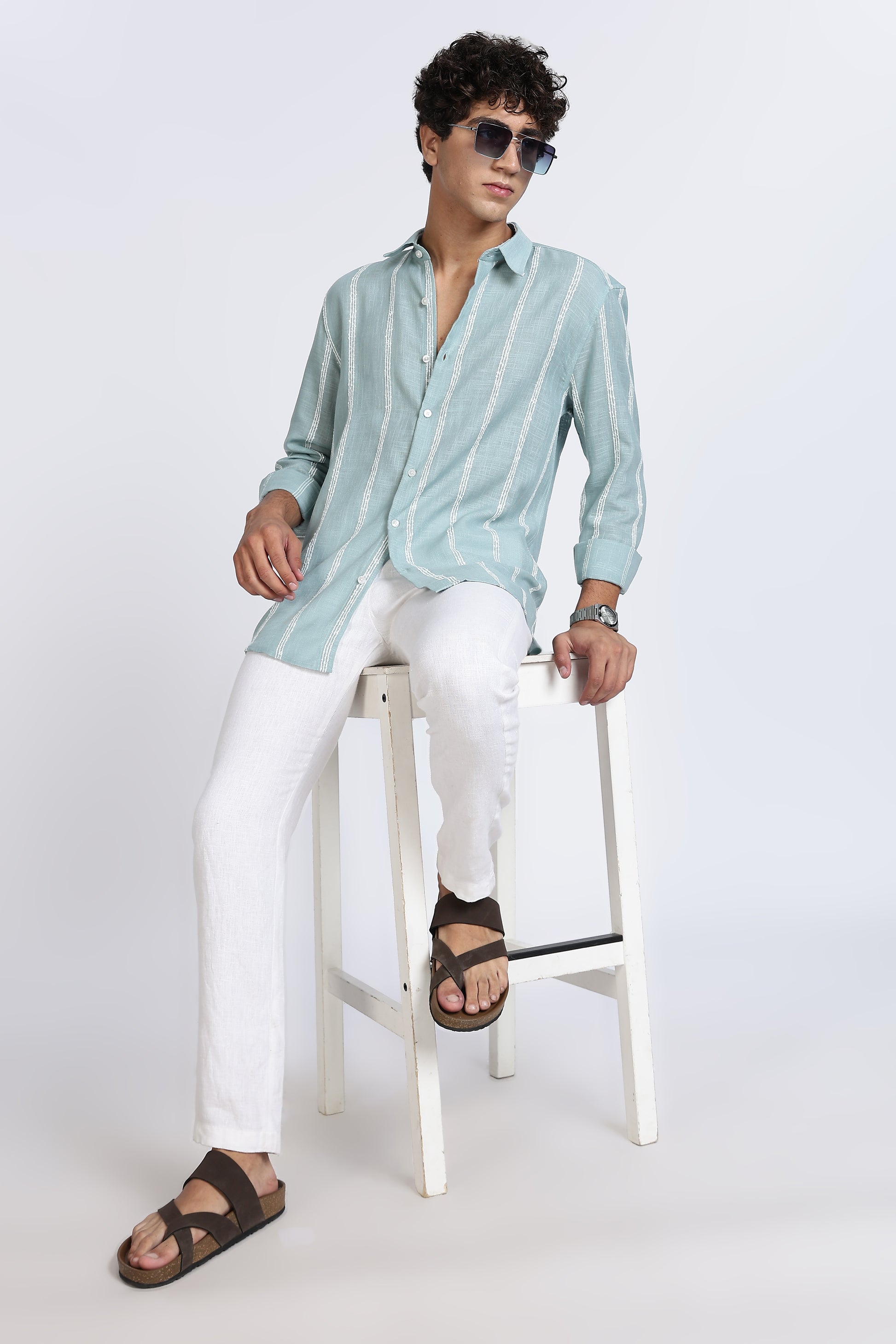 This shirt is styled in a refreshing mint green shade with vertical white stripes, giving it a clean and modern look. Crafted from lightweight linen, it features a regular fit, classic collar, and full sleeves, making it a breathable and versatile choice. Perfect for summer wear, it pairs effortlessly with white or beige trousers for a smart casual outfit.