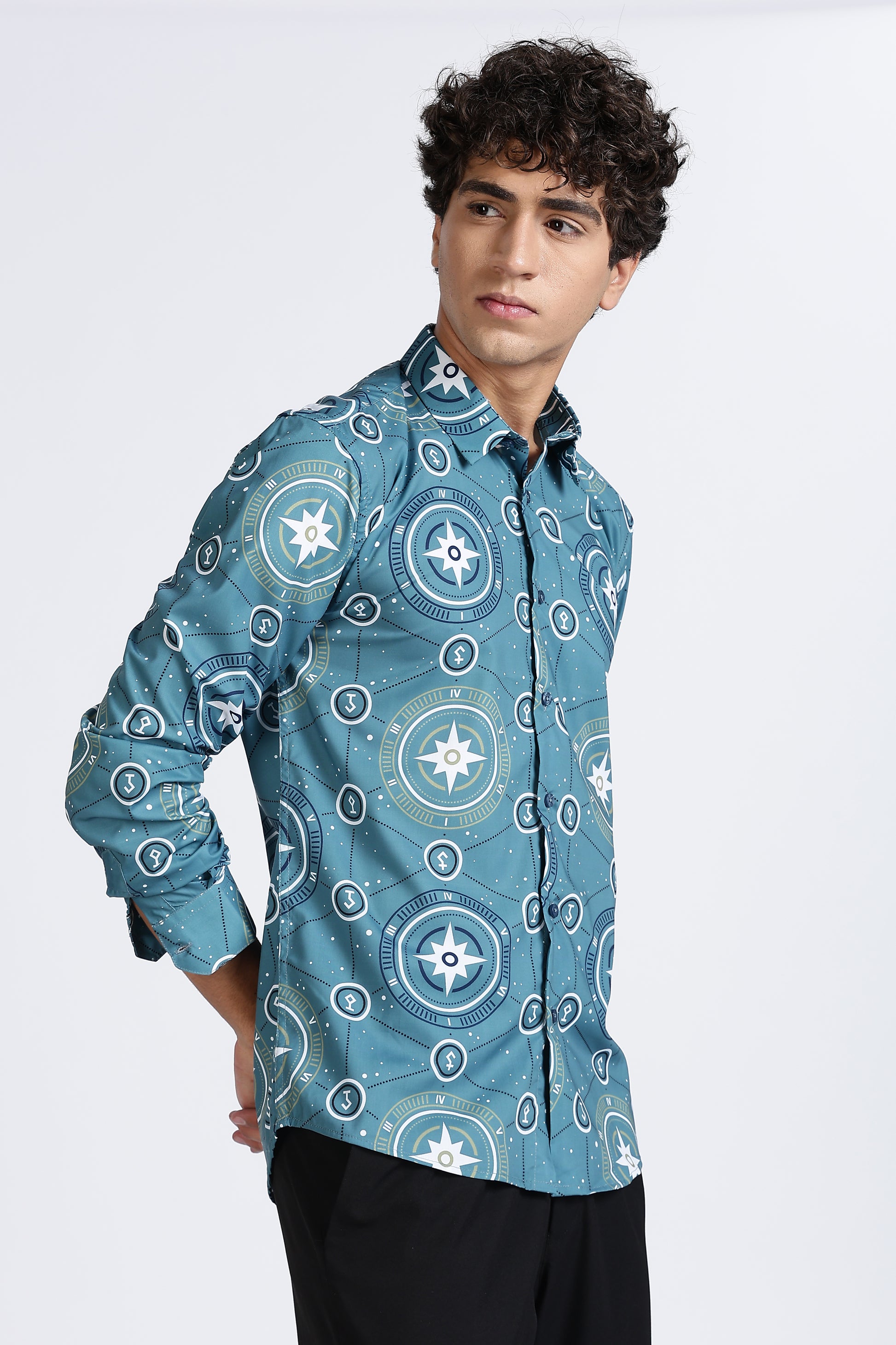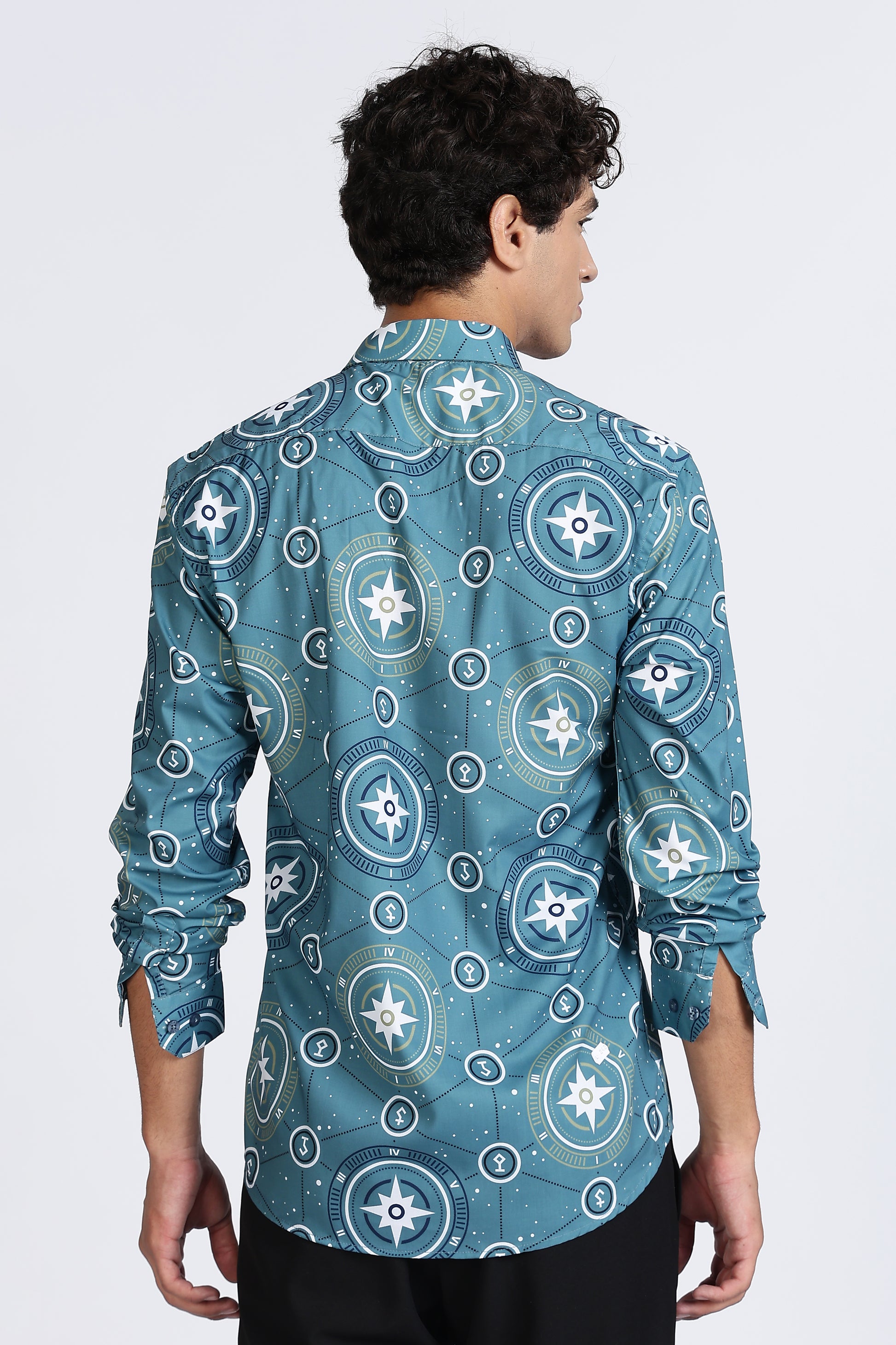 This shirt is styled in a teal base with an all-over compass-inspired print, giving it a bold and distinctive look. Featuring a regular fit, classic collar, and full sleeves, it blends comfort with a statement design. Pair it with black or navy trousers for a sharp contrast, making it ideal for casual outings or evening wear.