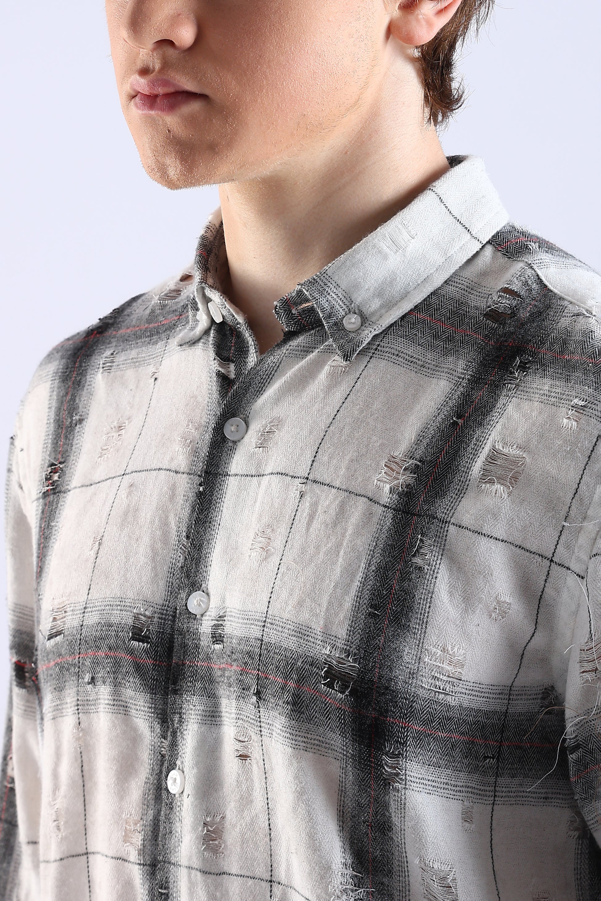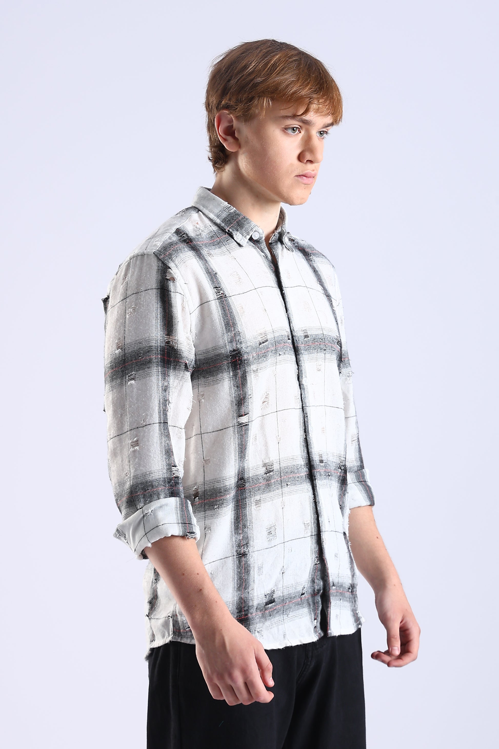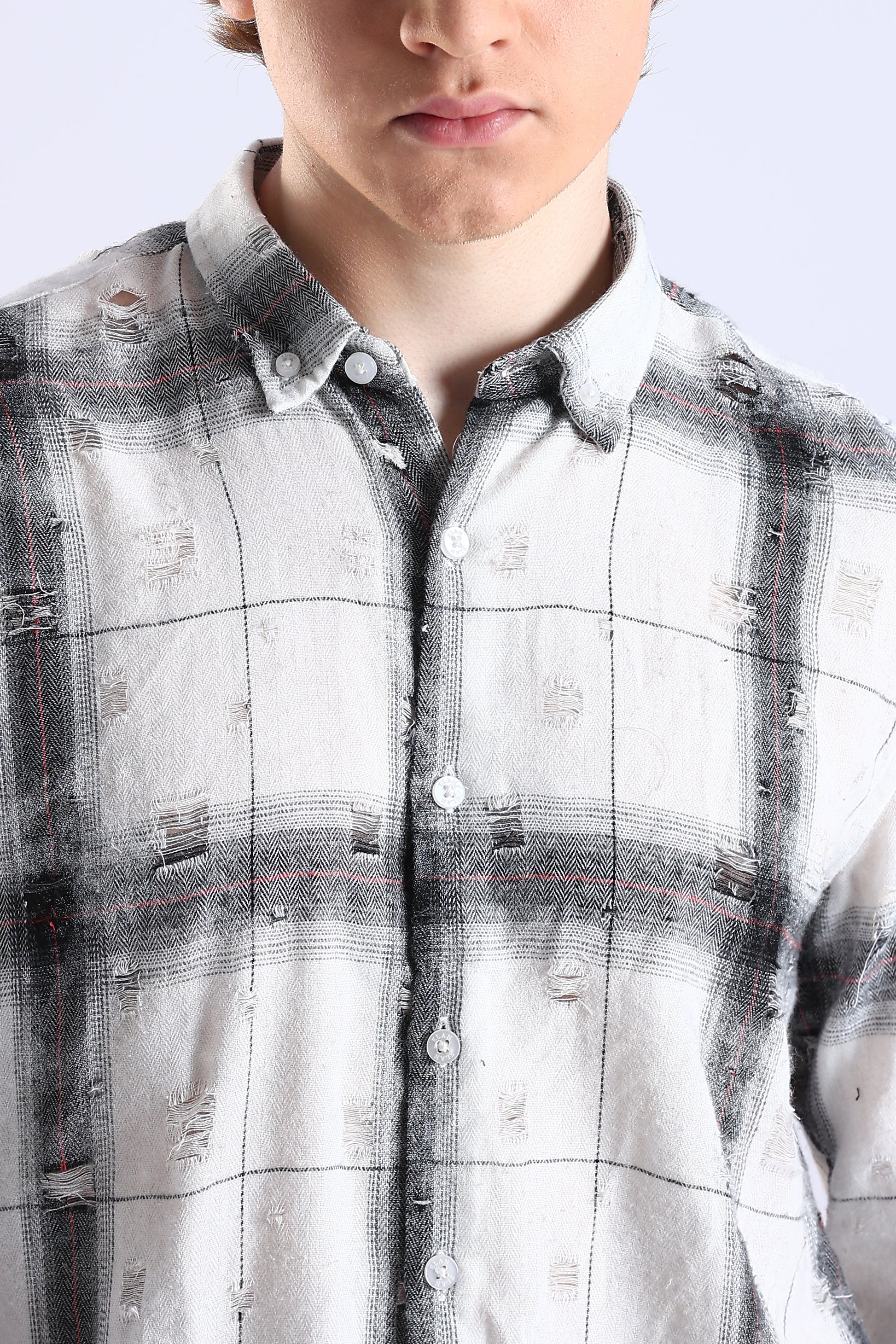The shirt is a long-sleeve, button-up style featuring a black and white plaid tie-dye pattern. It has a casual fit with a classic collar, buttoned cuffs, and a slightly curved hem, giving it a relaxed yet stylish look.
