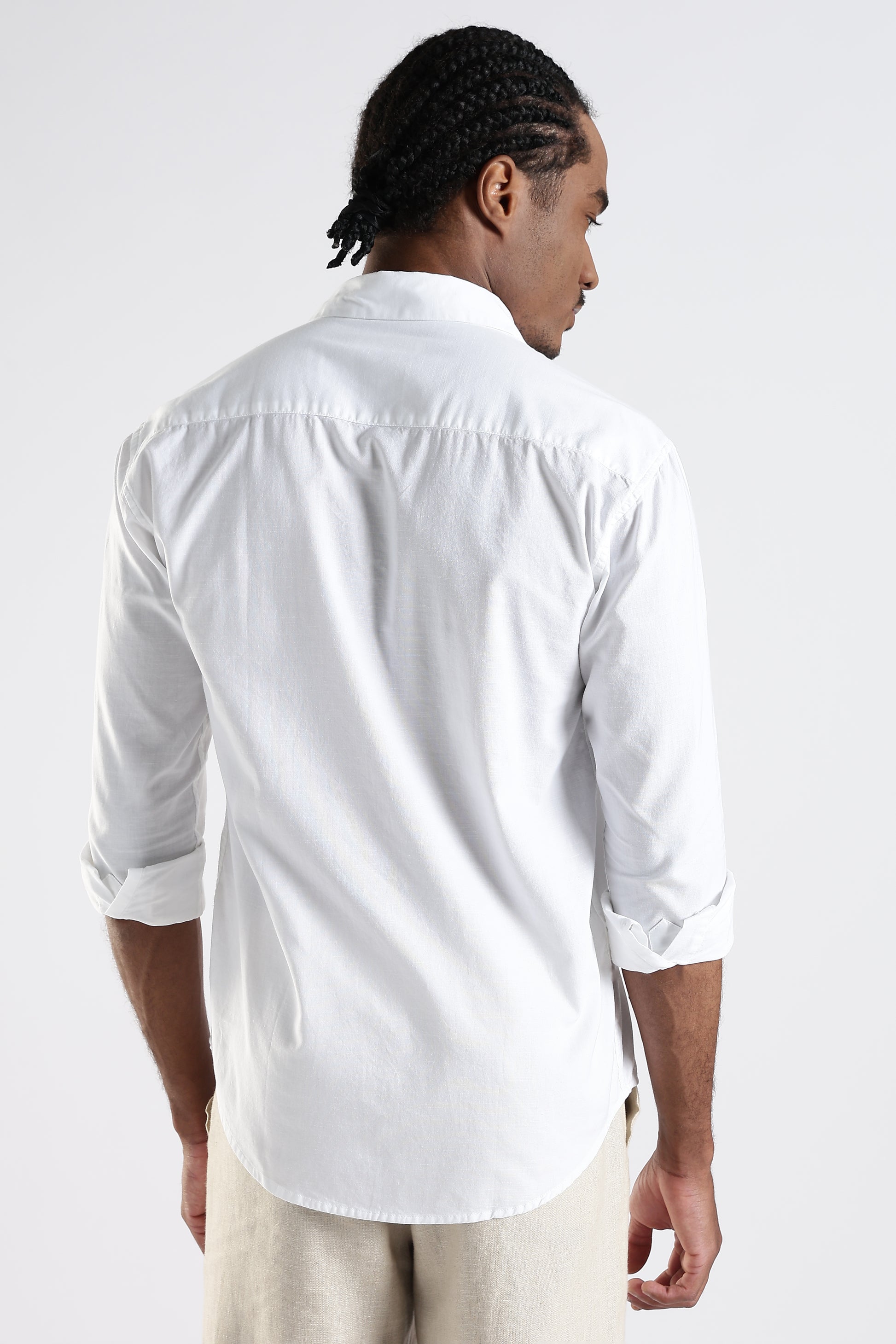 This white button-down shirt is a unique piece, featuring delicate, embroidered floral designs on either side of the chest. The embroidery consists of two flowers with light-colored petals and brown stems and leaves, adding an artistic touch. The shirt has a button-down collar and white buttons, creating a crisp, clean aesthetic.