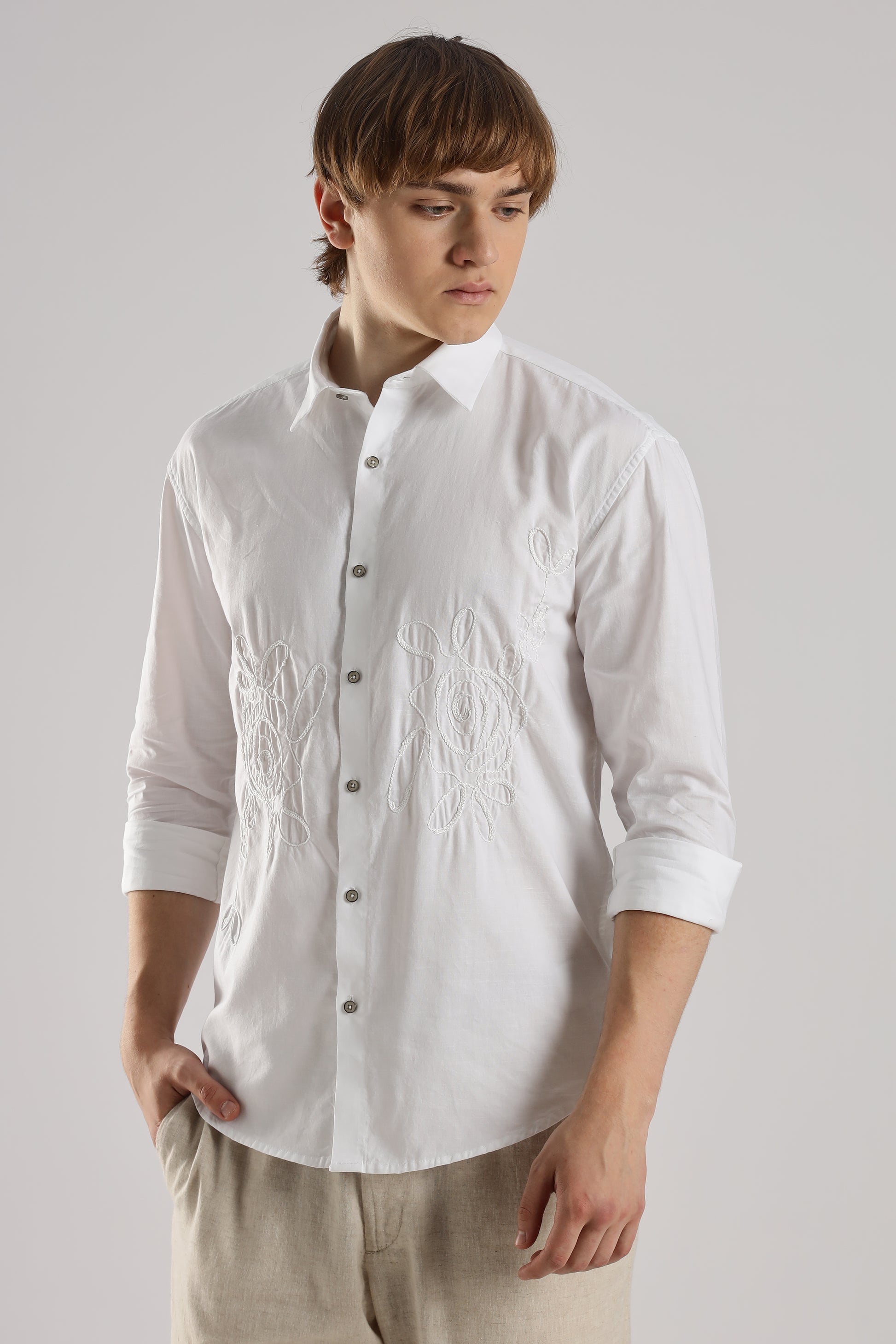 This shirt is crafted in a crisp white shade with delicate floral embroidery on the front, offering a subtle yet refined look. Made from a soft cotton blend, it features a regular fit, classic collar, and full sleeves for a balance of style and comfort. Ideal for festive occasions, evening wear, or smart casual outings, it pairs effortlessly with beige or dark trousers for a polished finish.